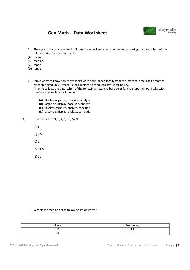 Math Teaching Resources | Teachers Pay Teachers This 2nd grade spiral math resource WITH 3 LEVELS OF DIFFERENTIATION is perfect math worksheets for math morning work, homework, daily math review, and independent math centers. It is a nice spiral review to take you through the entire year and is available in both printable and digital formats.2nd grade spiral math review for the ENTIRE YEAR includes 40 … PDF Grade 7 Data Analysis and Interpretation - edugains.ca TIPS4Math Grade 7 Data Analysis and Interpretation Overall Expectation Students will: • Collect and organize categorical, discrete, or continuous primary data and secondary data and display the data using charts and ... o worksheet to calculate the mean, median and mode. EduGAINS-Mathematics Page 6 of 13; TIPS4Math Grade 7. Analyse Secondary ... Mean, Median, Mode and Range Worksheets - Math Worksheets 4 Kids Central Tendency Worksheets: Mean, Median, Mode and Range. Mean, median, mode and range worksheets contain printable practice pages to determine the mean, median, mode, range, lower quartile and upper quartile for the given set of data. The pdf exercises are curated for students of grade 3 through grade 8. Interesting word problems are included ...